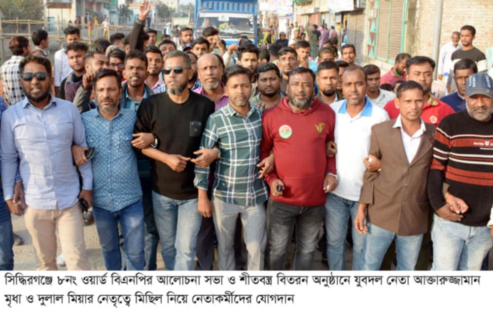 বিএনপির ভারপ্রাপ্ত চেয়ারম্যান তারেক রহমান ঘোষিত রাষ্ট্রকাঠামো মেরামতের ৩১ দফার জনসম্পৃক্ততা সৃষ্টিতে সিদ্ধিরগঞ্জের ৮নং ওয়ার্ড বিএনপি আয়োজিত আলোচনা সভা ও শীতবস্ত্র বিতরন অনুষ্ঠানে মহানগর যুবদলের যুগ্ম-আহ্বায়ক আক্তারুজ্জামান মৃধা ও ৭নং ওয়ার্ড যুবদলের সাবেক ভারপ্রাপ্ত সভাপতি দুলাল মিয়ার নেতৃত্বে মিছিল নিয়ে নেতাকর্মীরা যোগদান করে।